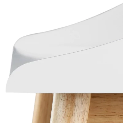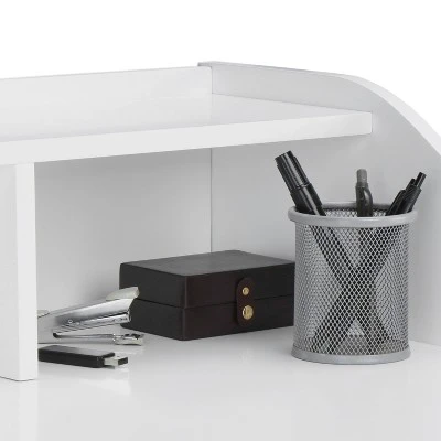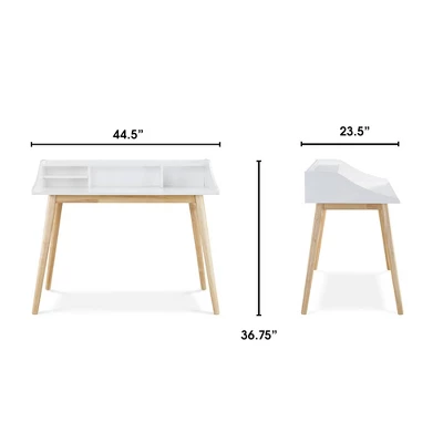 Bring mid-century modern style and sophistication to your room with this compact writing desk. This desk has a fresh white finish and light natural wood legs for a neutral color that fits in any room style. In addition to the popular mid-century style, this desk has a slim profile, allowing it to fit easily in a small room or apartment space without fear of the desk overpowering the room. Storage on this desk is available in the cubbies and shelf, while the desk top has enough room to hold a laptop computer.