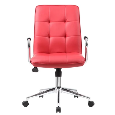 This Red Modern Task Chair is beautifully upholstered with ultra-soft Caressoft. Its high crown chrome base provides enhanced stability, and the chrome arms provide elegant and comfortable arm rests. It has an upright locking position feature, providing comfortable back support. The pneumatic adjustable gas lift allows for easy seat height adjustment, to help you find the personalized sitting style that suits you and your work environment. The adjustable tilt tension control knob, located under the seat, allows you to customize the tension of the tilt. The hooded double wheel casters make it easy to move and shift directions.